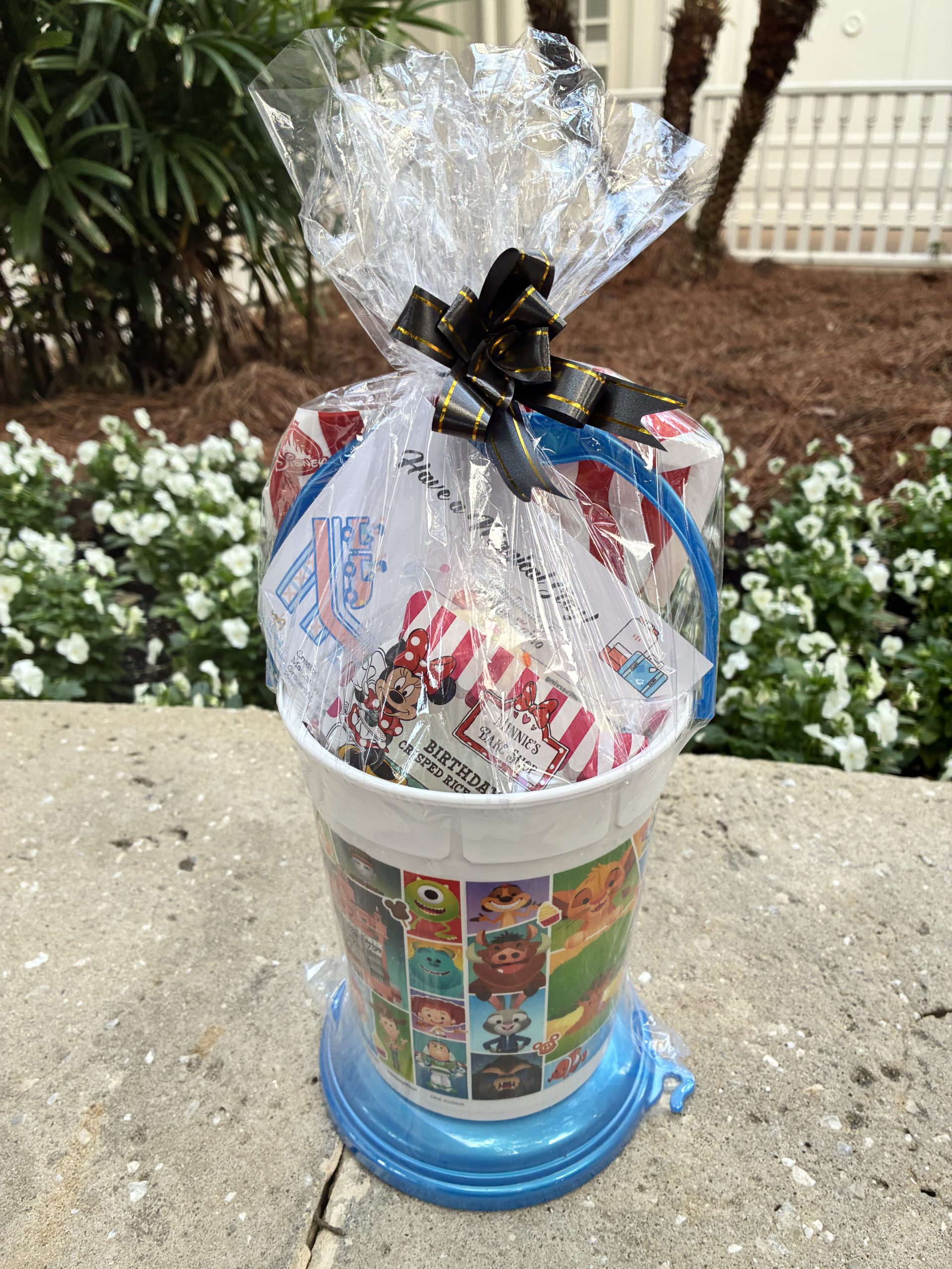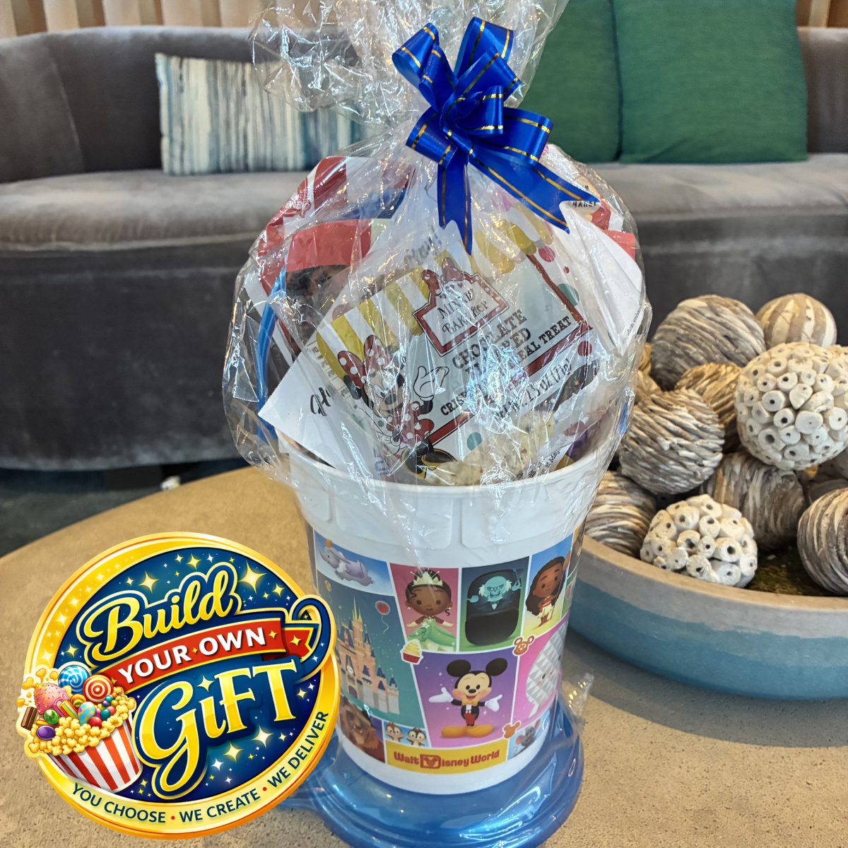 Add a fun theme park favorite to your order with a popcorn bucket filled with treats, snacks, and surprises.